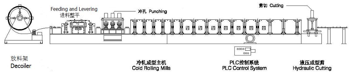 Decoiler →Feeing and Leveling Device→Hydrualic Punching device →Main forming machine